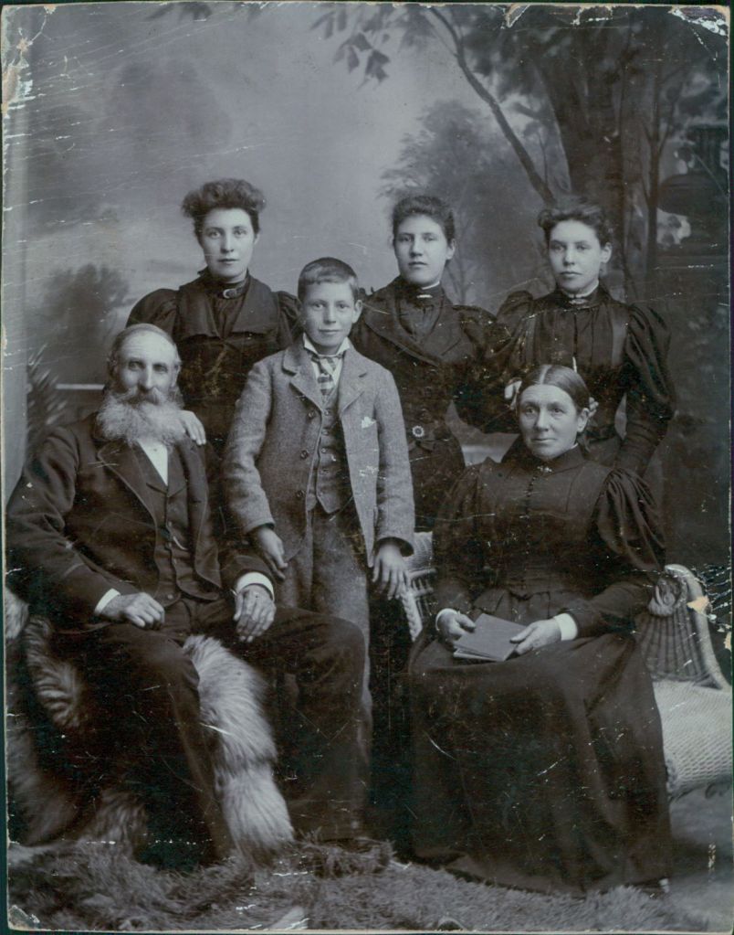 This is a photograph of my 3 x great grandparents George GARDEN (1923-1907) and Margaret STRATHDEE (1838-1925) and four of their children. From left to right is George. Elizabeth GARDEN (1878-1913), my 2 x great grandmother, stands just behind him. Then comes James GARDEN (1884-1968) and Janet GARDEN (1876-1951). Margaret is sitting at the front. Lastly is Georgina GARDEN (1881-1964). This photograph was taken in the 1890’s, before Janet emigrated to America.