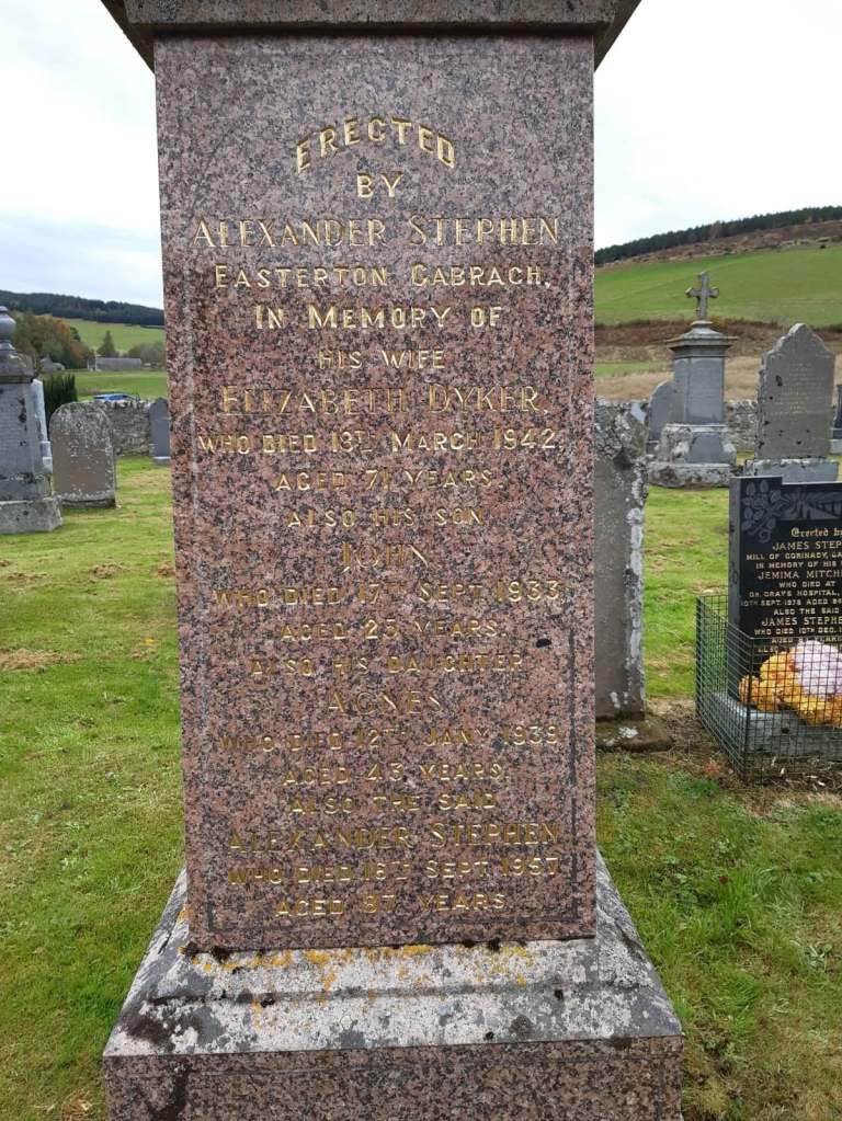 On 28 January 1870 Alexander Stephen was born at Greenhowe in Glass. He was the youngest of seven children born to James Stephen and Agnes Walker. Alexander had six older siblings, three brothers (William, John and Robert) and three sisters (Helen, Margaret and Elspet).