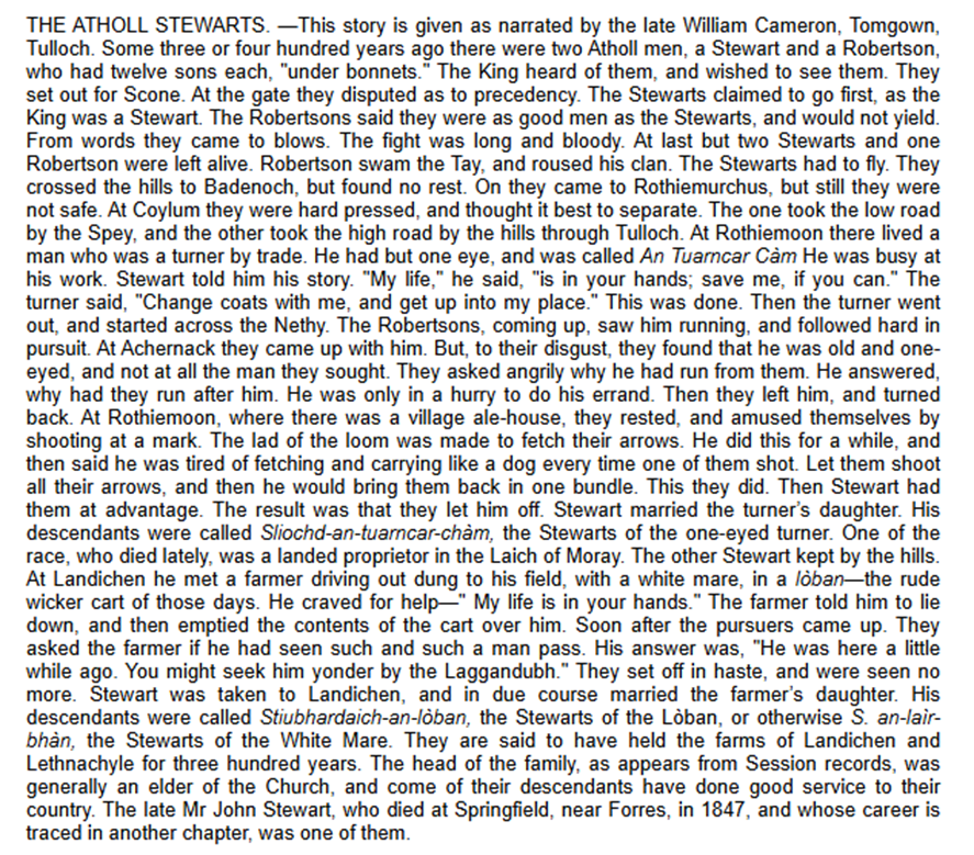 There is a story in Rev. W. Forsyth’s book In The Shadows of Cairngorm, the chronicles of the United Parishes of Abernethy and Kincardine (1900). In this book, he states that the Stuarts of Lethnachyle are one of the oldest families and were originally from Atholl.
